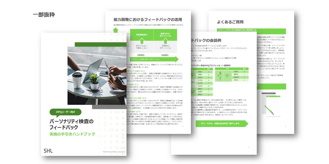 1on1ミーティングなどを中心として、「個」にフォーカスした能力開発の取組が注目されています。個人の特性に着目したフィードバックや能力開発を行うために、パーソナリティ検査をぜひご利用ください。 本資料では、パーソナリティ検査のフィードバックの目的、注意点、実際の会話例、よくあるご質問などをご紹介します。ぜひご活用ください(全16ページ)。
